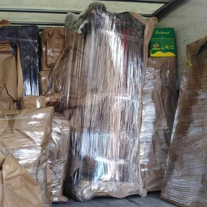 ويتم تغليف الاثاث باجود أنواع التغليف ( تغليف بورق مبطن باسفنج – وتغليف بنايلون. . . وغيرها )